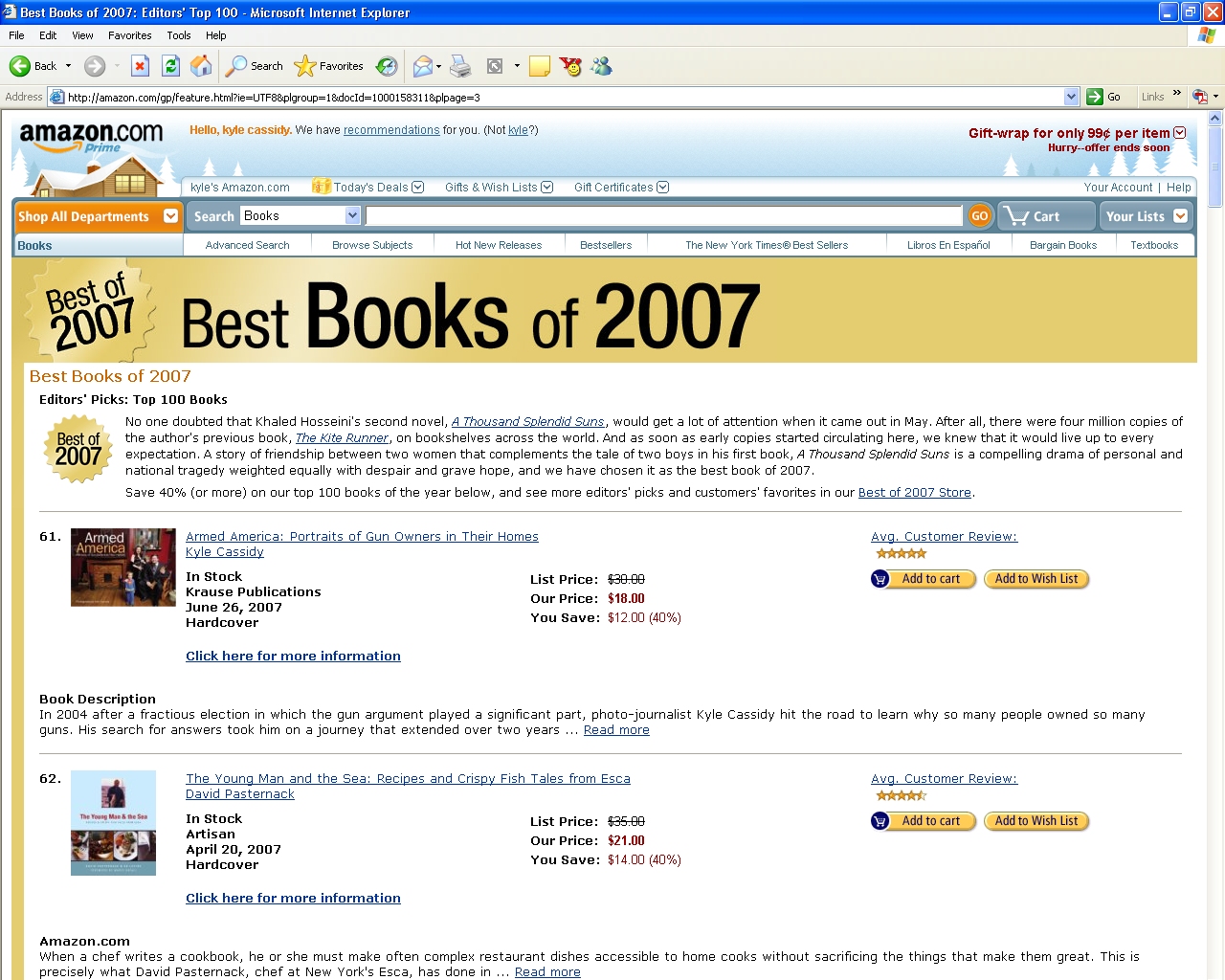 [Author Prev] [Author Next] [Thread Prev] [Thread Next] [Author Index] [Topic Index] [Home] [Search]Congratulations Kyle, good on you. And with Christmas just around he corner next month I bet it'll sky rocket purchased as a gift! ted -----Original Message----- From: lug-bounces+tedgrant=shaw.ca@leica-users.org [mailto:lug-bounces+tedgrant=shaw.ca@leica-users.org] On Behalf Of Kyle Cassidy Sent: Wednesday, November 14, 2007 10:10 PM To: lug@leica-users.org Subject: [Leica] Armed America - Amazon's Best Books of 2007 - #61 At the risk of pulling a muscle in my arm patting myself on the back (and annoying y'alls) -- Amazon.com just saw fit to list me at #61 in their editors picks for "Best Books of 2007" -- woah dang! Thanks Ted and BD and Jim -- as well as Brian and Peter Miller -- without whom none of this would be. http://www.armedamerica.org/press/best-of-amazon-07.jpg It's also in this months German edition of FHM (read it for the articles -- they make multitudinous jokes about how lame american sex is). kc _______________________________________________ Leica Users Group. See http://leica-users.org/mailman/listinfo/lug for more information -- No virus found in this incoming message. Checked by AVG Free Edition. Version: 7.5.503 / Virus Database: 269.15.31/1130 - Release Date: 11/14/2007 9:27 AM
