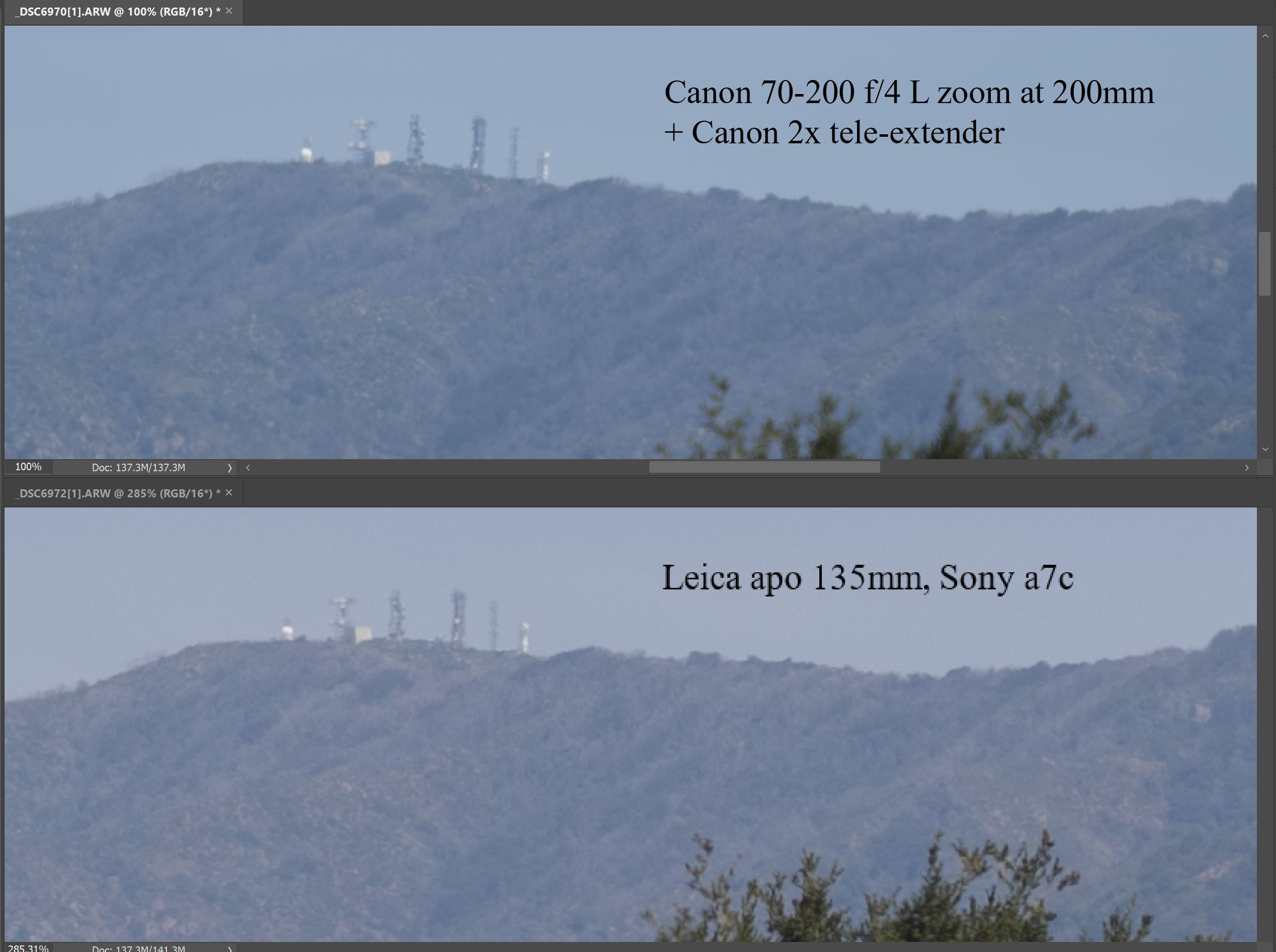 [Author Prev] [Author Next] [Thread Prev] [Thread Next] [Author Index] [Topic Index] [Home] [Search]Frank Filippone via LUG <lug at leica-users.org> wrote: > Paul, can you elaborate on the comparison? Different focal lengths produce > different areas of interest. Both areas were centered (approximately) in their optical fields. The Leica, off axis, would probably have had a (more) major advantage over the Canon. > Do you blow up the Leica image in LR or other > so that the comparison shows the same area of interest? > I just used Photoshop, and it's just the monitor view that was enlarged. You can see the PS degree of image enlargement in the upper left of each image border. > Did you put the 2x converter on the Leica ... No, I don't have any extender for the Leica on a Sony. The Canon extender fit the Canon zoom, and then a Canon to Sony adapter allowed me to put the combination on the Sony. > ... With converter and lens set at 135? > It would be even worse for the Canon. > What about the corners? > Again, the comparison would be even worse for the Canon. The zoom is relatively soft off axis. The Leica apo is very good across the field. But if anyone wants a Canon 70-200 f/4 L zoom, it's for sale and will soon be on eBay. Paul > On Sun, Jul 18, 2021 at 1:12 PM Paul Roark via LUG <lug at leica-users.org> > wrote: > > > I already knew the Leica 135 apo could seem more detail than the Canon L > > series 70-200mm zoom at 200mm. What about the Canon zoom at 200mm with a > > Canon 2x extender? I just tried both on my Sony a7c, focused on a > distant > > hilltop. > > > > See https://www.paulroark.com/Canon-zoom-v-Leica-apo135.JPG . > > > > Close, and no comparison on a weight & size adjusted basis. > > > > For what it's worth, > > > > Paul > > www.PaulRoark.com > > > > _______________________________________________ > > Leica Users Group. > > See http://leica-users.org/mailman/listinfo/lug for more information >